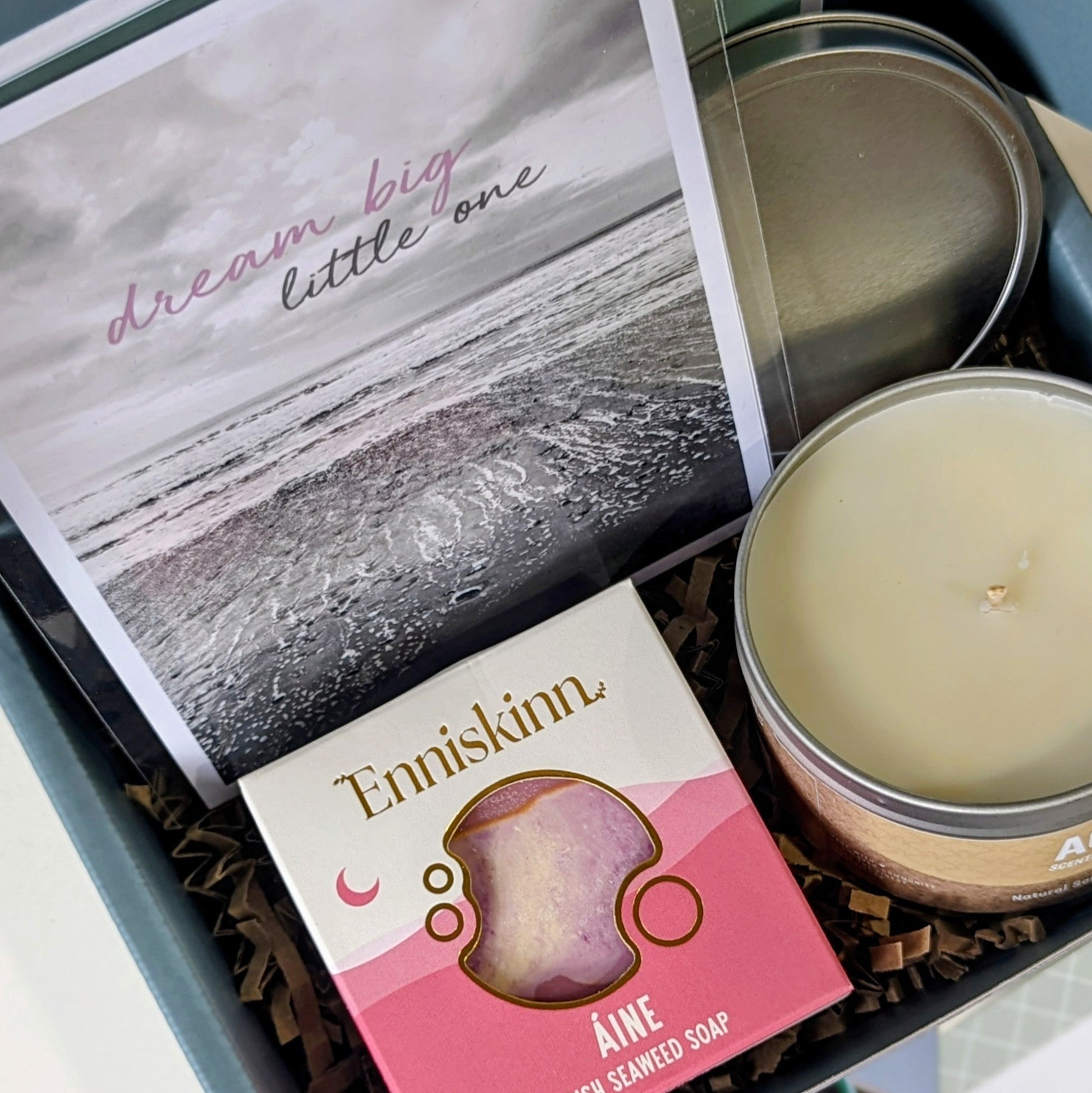 A little token of indulgence for new parents, packed with ethical and locally made goodies. A small moment of pampering and a touch of beautiful artwork to brighten their day.